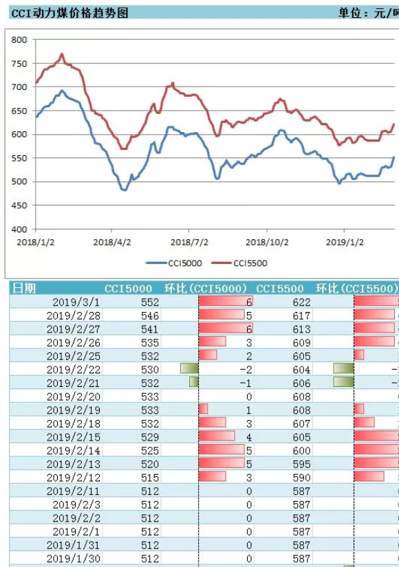 3月1日中國煤炭資源網最新一期的CCI動力煤價格顯示,CCI5500動力煤價格報622元/噸,連續五期持續上調,較上期價格上調5元/噸,較上月同期價格上調35元/噸或6.0%;CCI5000動力煤價格報552元/噸,較上期價格上調6元/噸,較上月同期水平上調40元/噸或7.8%。